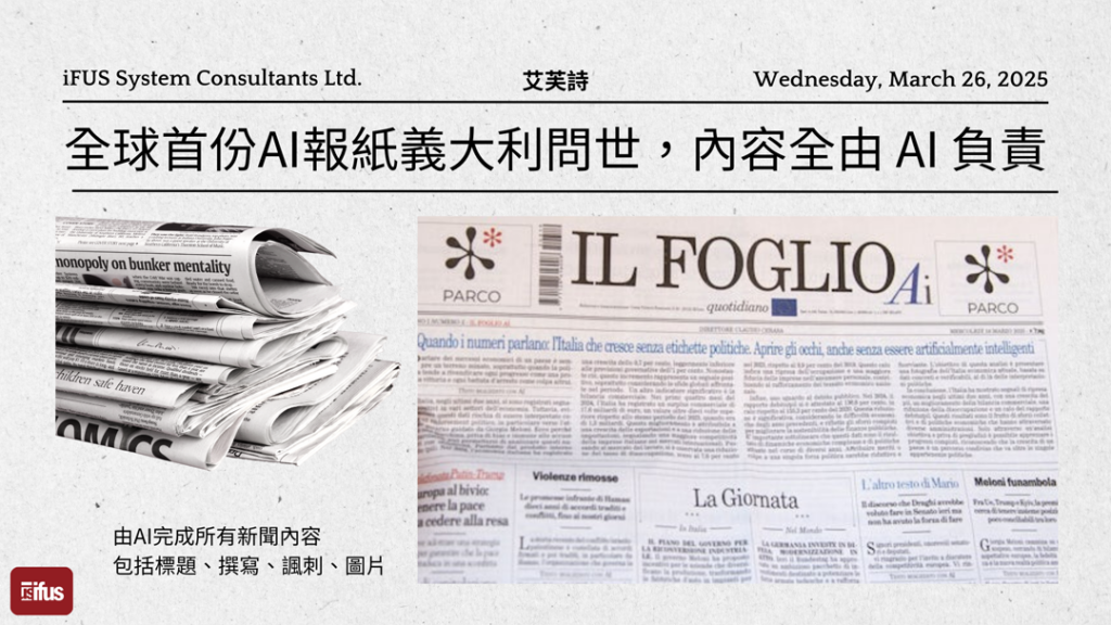 義大利報紙《Il Foglio》推出全球首份全由AI製作的報紙《Il Foglio AI》,為期一個月的實驗專